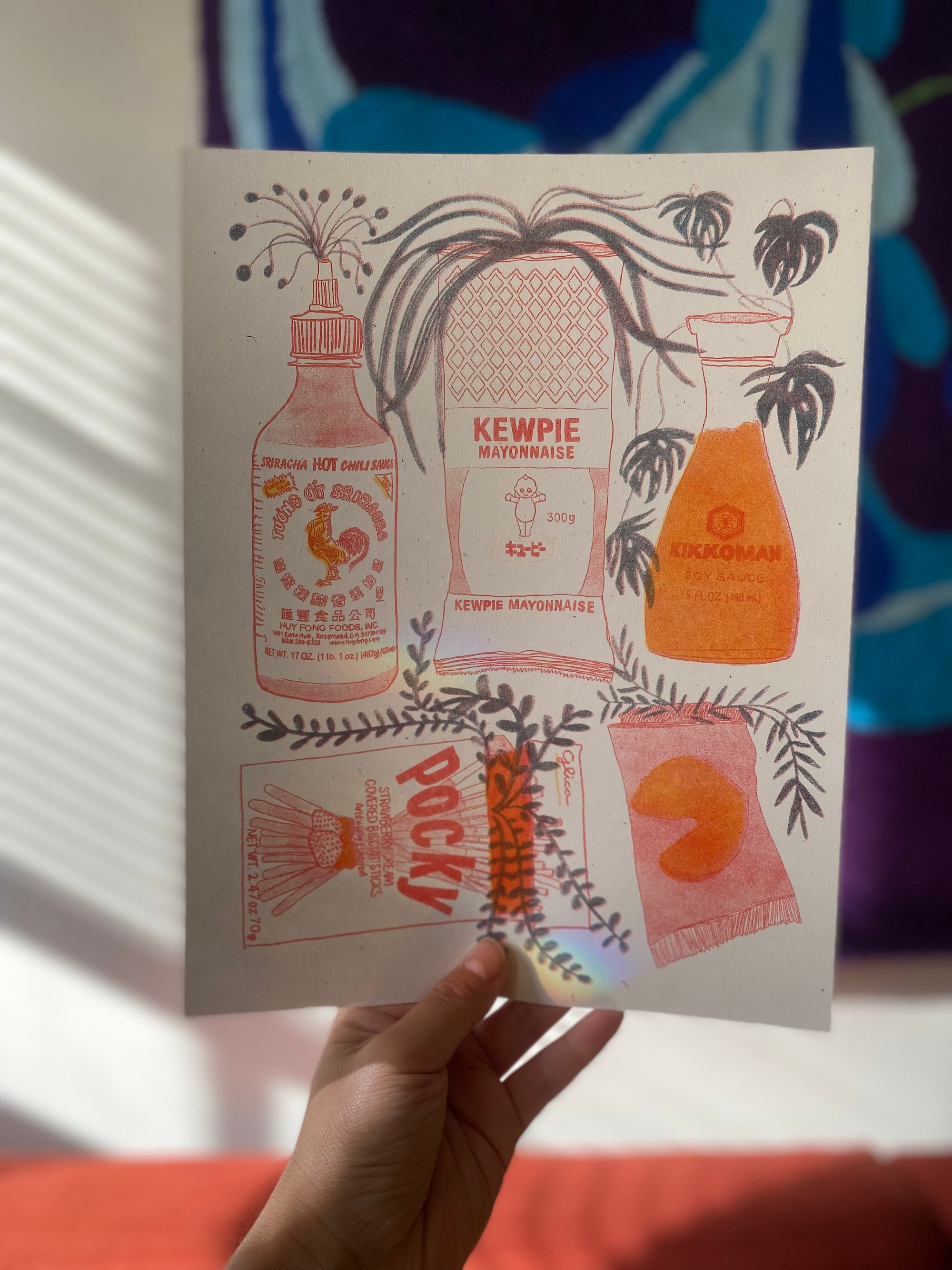 quintessential asian snax print sriracha, kewpie mayo, soy sauce, pocky, and a fortune cookie for after dinner
